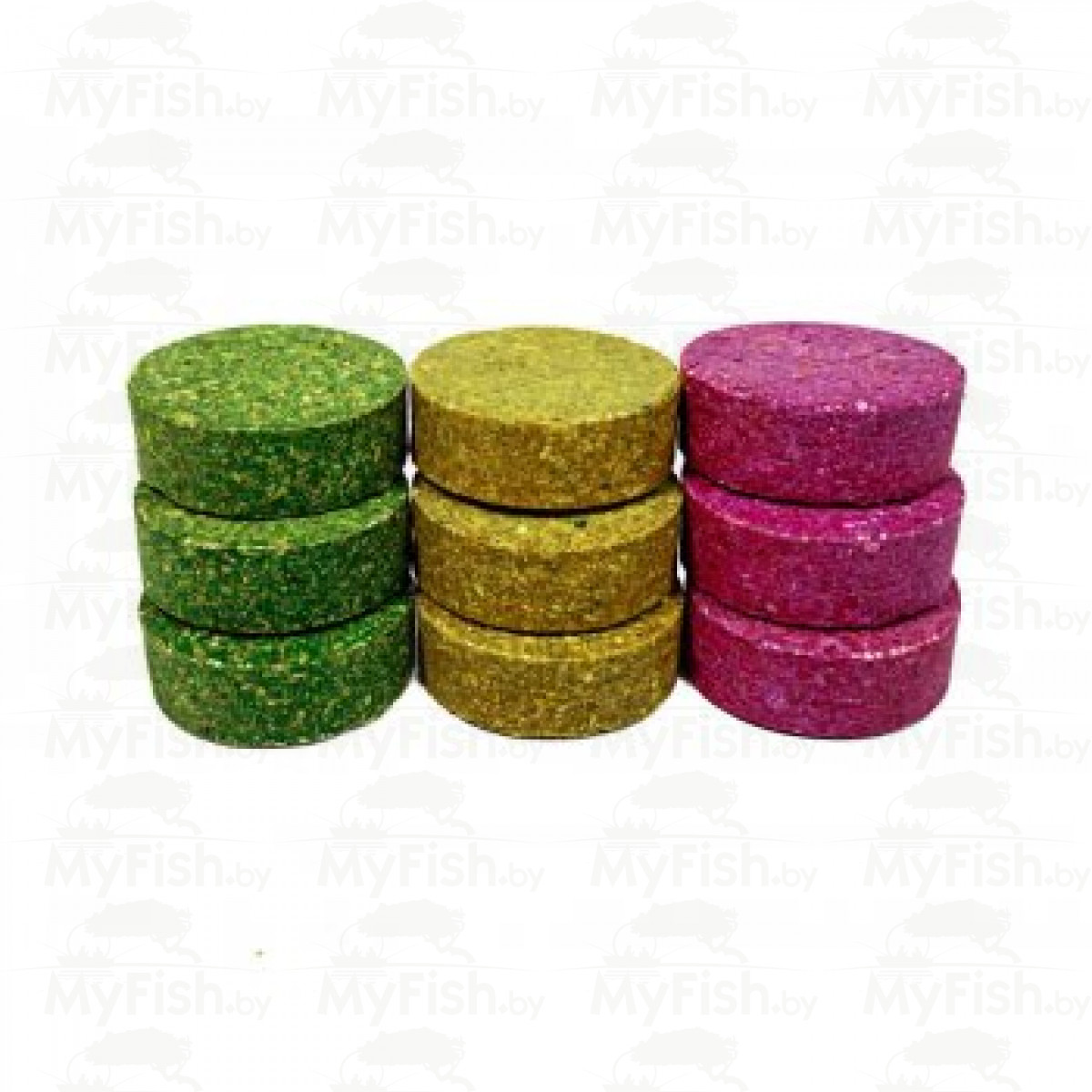 Пылящие диски флуоресцентные, предназначены для прикармливания и приманивания рыбы к месту ее ловли. Диск диаметром 47 мм состоит из плотно прессованной фракции дробленых злаковых и масличных культур, кукурузной патоки, ароматизатора и флуоресцентного красителя. Толщина диска равна примерно 18-19 мм.